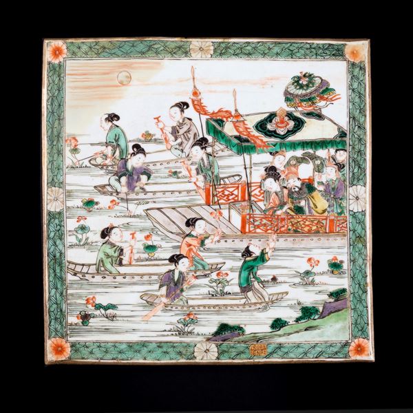 Well-painted with enamels in overglaze green, red, purple, yellow and brown, they respectively depict a scene of warriors on horseback and women in boats on the water amidst lotus flowers.