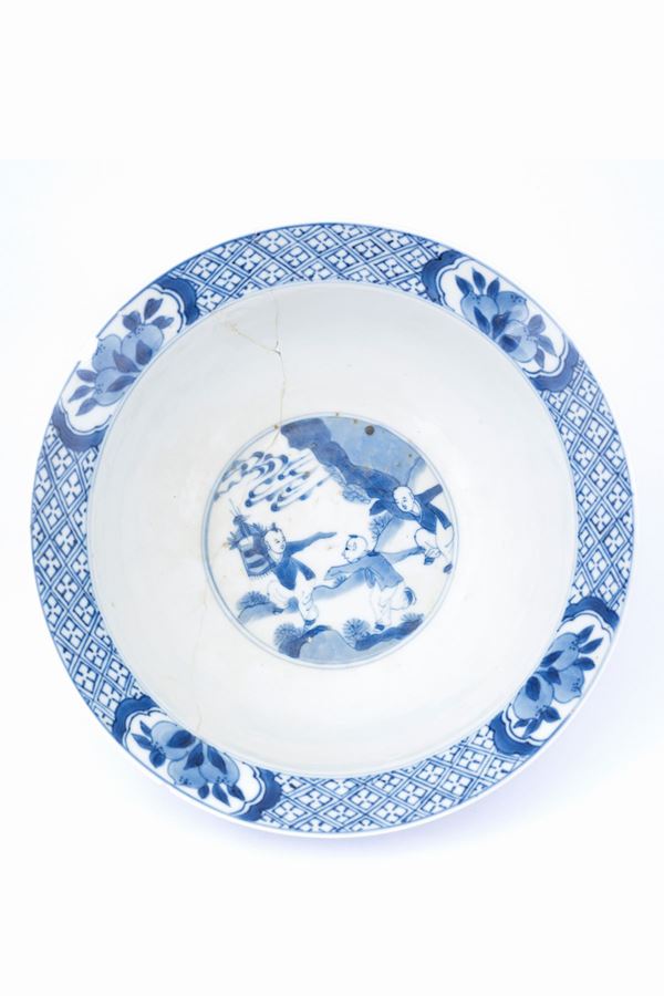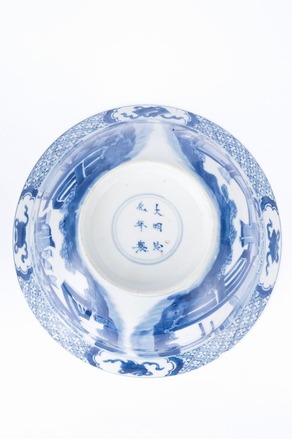 Well-painted in blue below deck with two court scenes depicting characters in gardens on the outside, three children playing in a landscape in the inner centre; on the rim inside and outside it has beehive motifs and four reserves with peaches and Buddhist symbols; in the centre of the base it bears the six-character apocryphal mark in underglaze of Emperor Chenghua within a double circle.