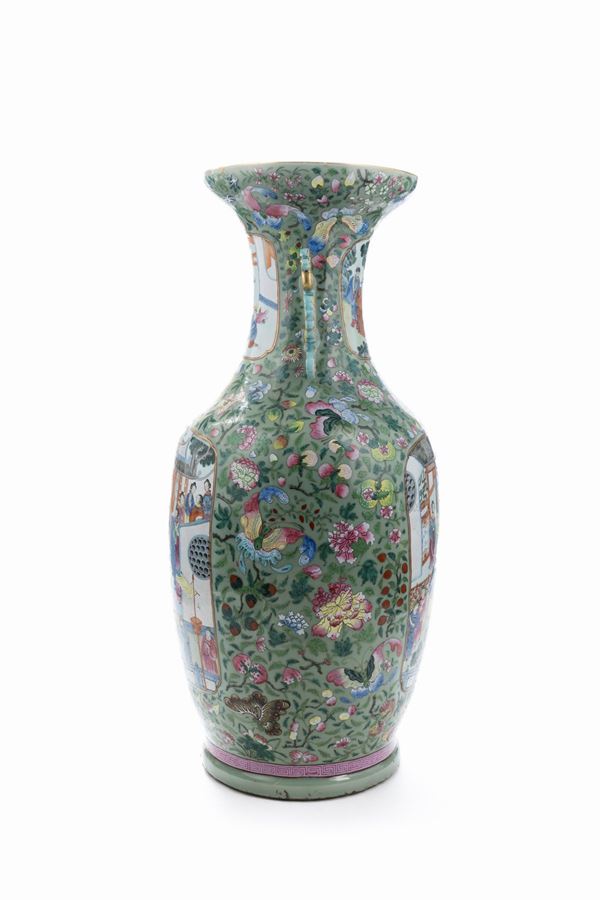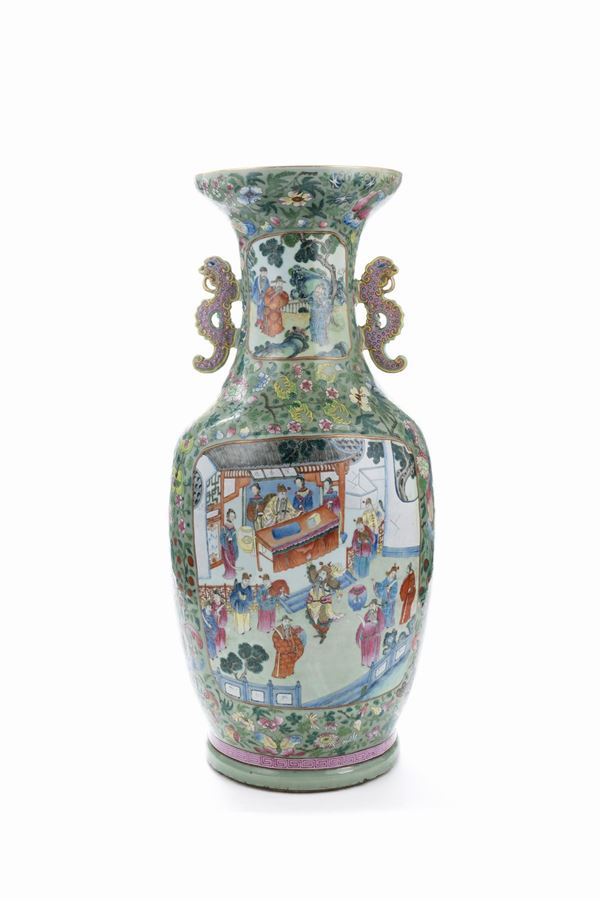 Featuring two qilong-shaped handles on the sides and painted with famille rose enamels, it is finely decorated on the body and neck with two reserves respectively depicting men and women conversing inside rooms or in gardens. The celadon ground is adorned with flowers, Buddha's hand fruits, butterflies, peaches, pomegranates, lychees, melons, and other fruits.