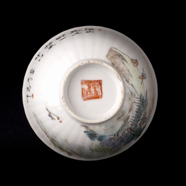 Dalla bella forma lobata a forma di crisantemo, è magistralmente dipinta con un paesaggio in perfetto stile Qianjiang; sul retro reca delle iscrizioni dov’è presente la firma dell’artista Ziming (子明) e la data ciclica ji chou (己丑) corrispondente all’anno 1889. Sulla base è impresso il marchio apocrifo sigillare in rosso dell’Imperatore Tongzhi.