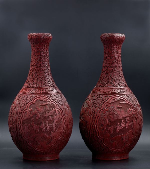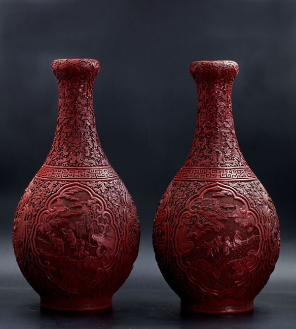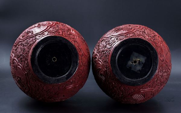 COPPIA DI GRANDI VASI ‘A TESTA D’AGLIO’ IN LACCA DI CINABRO, Cina, fine XVIII / inizio XIX secolo
