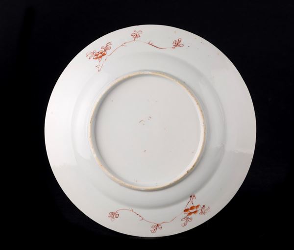 Ben decorati su un fondo “blu polvere” (soufflé) nei colori della famiglia verde, con quattro riserve sul bordo con fiori, insetti e uccelli e un medaglione centrale nel quale è raffigurato un leone; sul retro sono raffigurati due rami fioriti in rosso ferro.