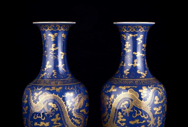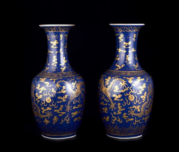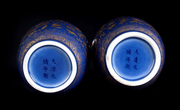 COPPIA DI VASI BLU E ORO IN PORCELLANA, Cina, marchio e periodo Guangxu (1875-1908)