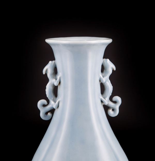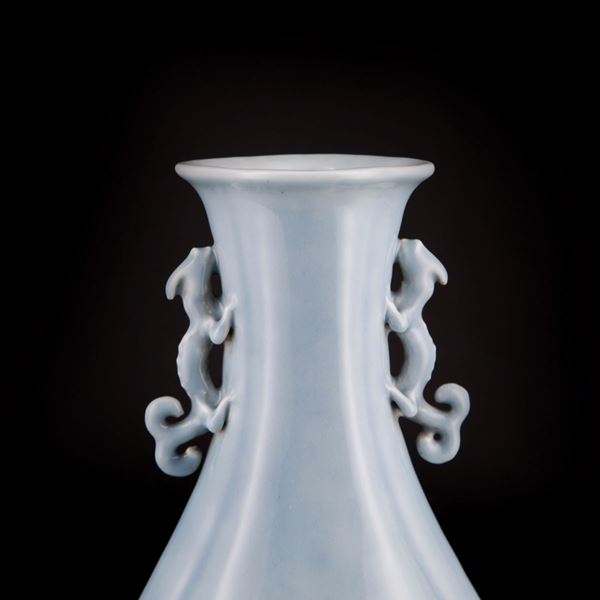 Dalla sinuosa forma quadrilobata che parte da un alto piede allargandosi nel corpo e progressivamente si restringe fino a culminare con un bordo svasato, ai lati presentano due manici a forma di qilong; sono completamente ricoperti da un bello smalto azzurro chiaro ad eccezione della base bianca, dove al centro presenta il marchio sigillare a sei caratteri in blu sotto coperta dell’Imperatore Qianlong.