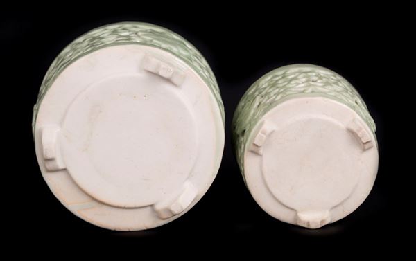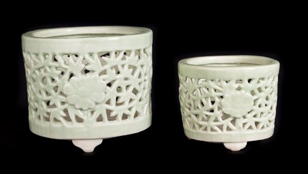 DUE RARI INCENSIERI IN PORCELLANA CELADON FORATA, Cina, dinastia Qing, periodo Kangxi (1661-1722)