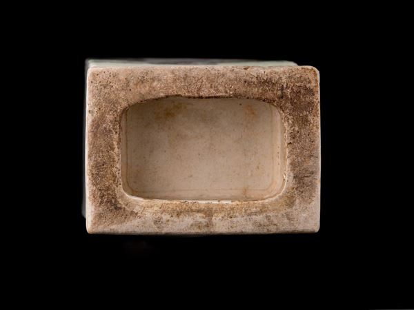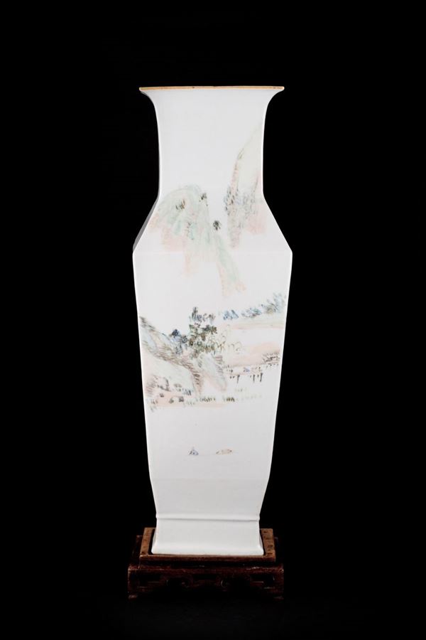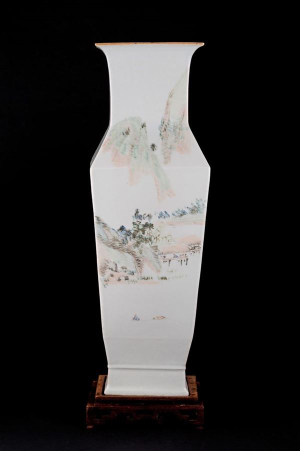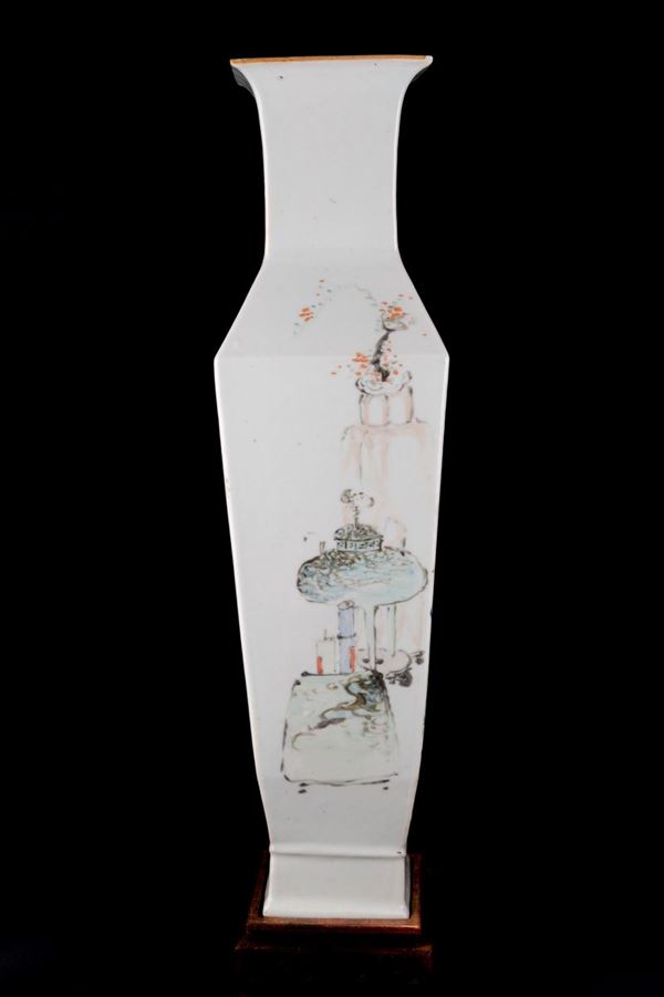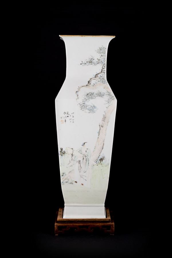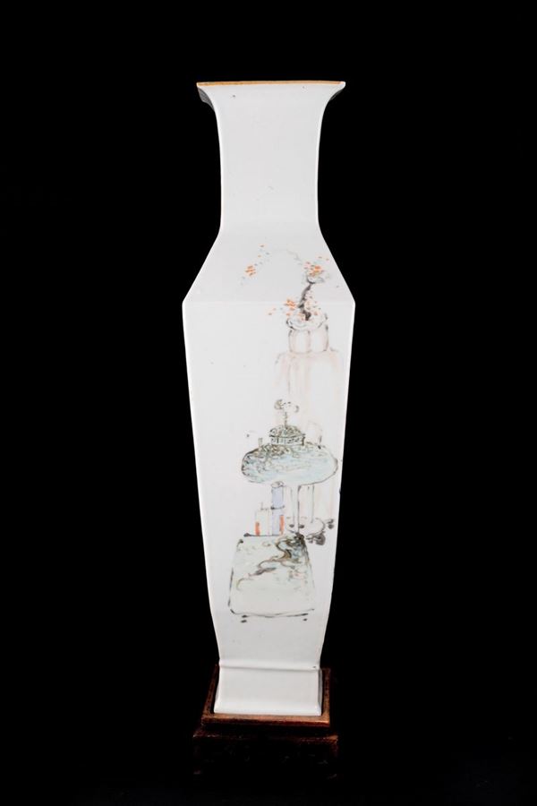 Dalla Insolita forma squadrata che sorge da un piede trapezoidale, corpo rastremato e collo svasato, è magistralmente dipinto su ogni lato con un soggetto diverso, tipico dello stile Qianjiang: un paesaggio, un uccello tra foglie, un uomo in un giardino e degli oggetti antichi; sulla faccia con il personaggio in alto a sinistra reca delle iscrizioni nel quale si trova la firma di Ren Huanzhang (任焕章). Su sua base in legno.