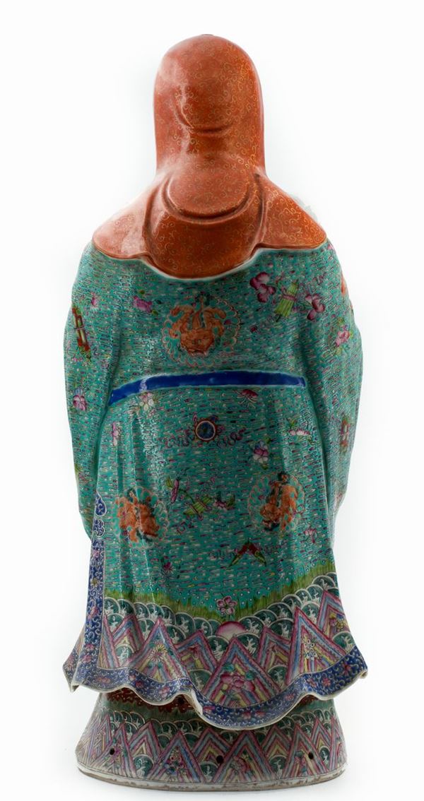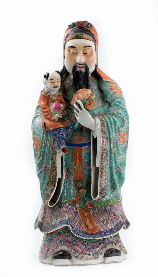 Ben modellata a forma di un saggio che tiene in mano uno scettro ruyi e in braccio un bambino con in mano una pesca, la veste è ben dipinta con smalti famiglia rosa; sulla base è impresso il marchio Mao Jiseng Zao (茂记生造).