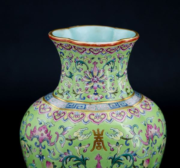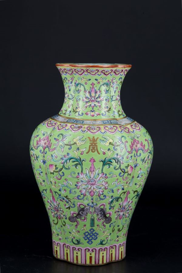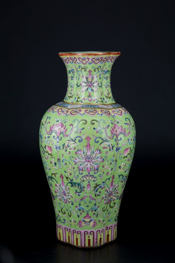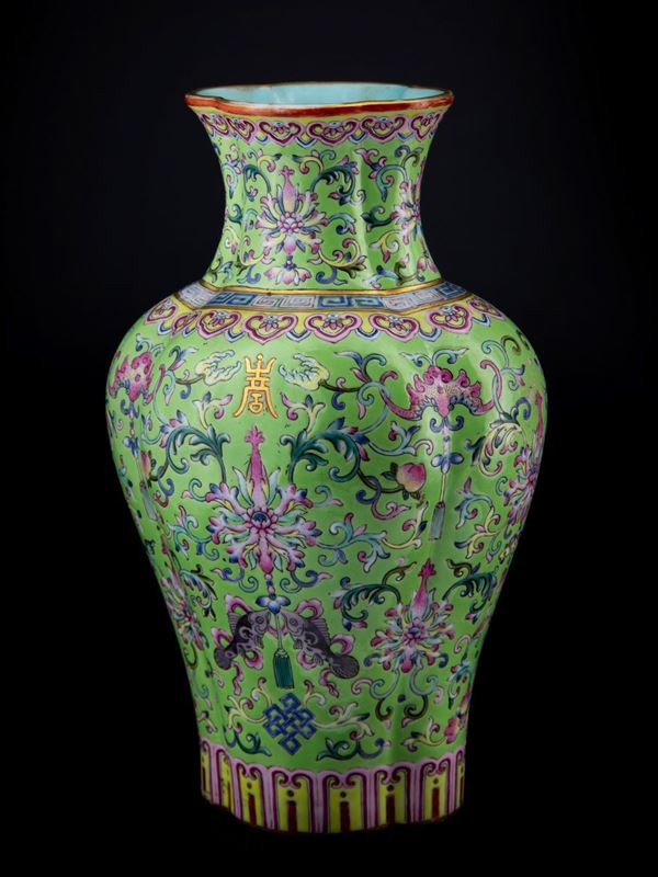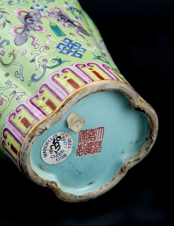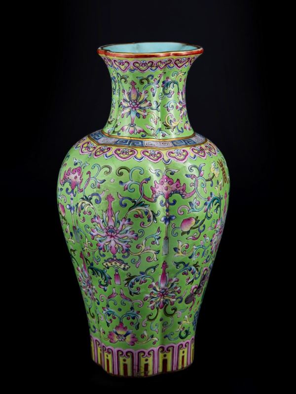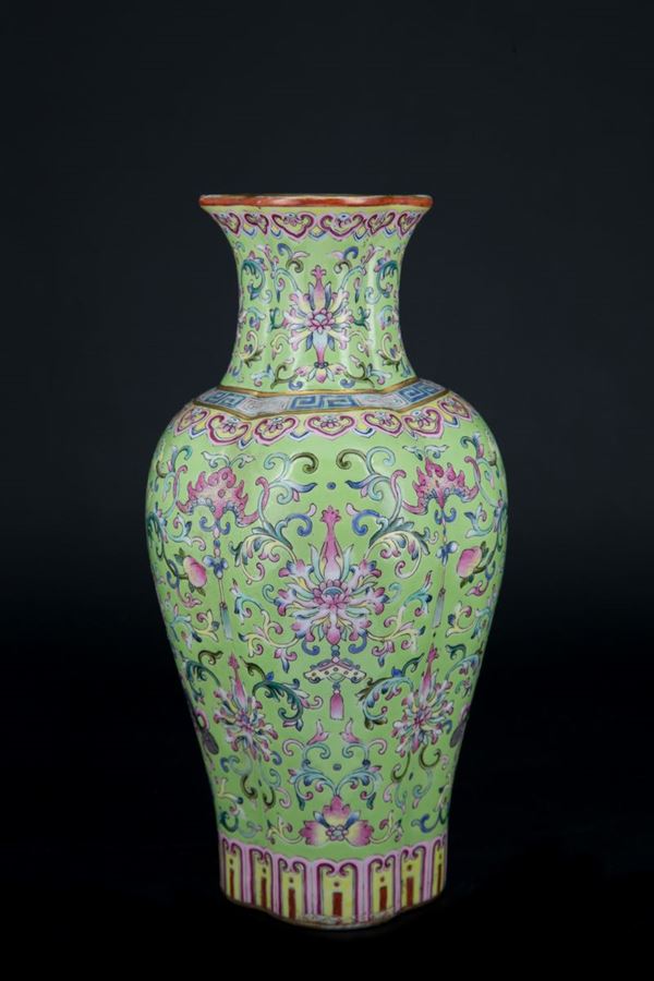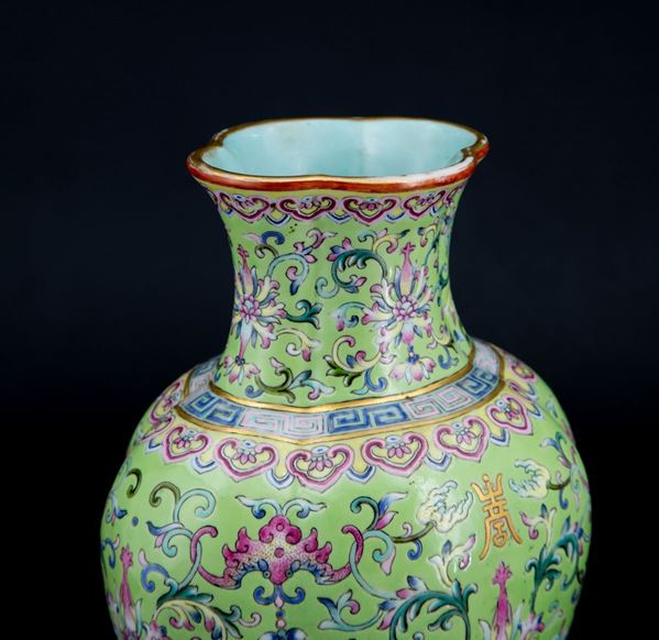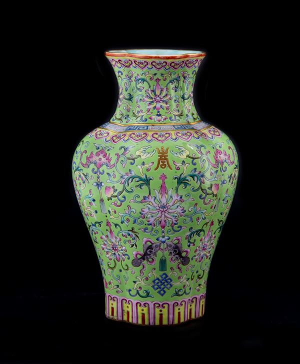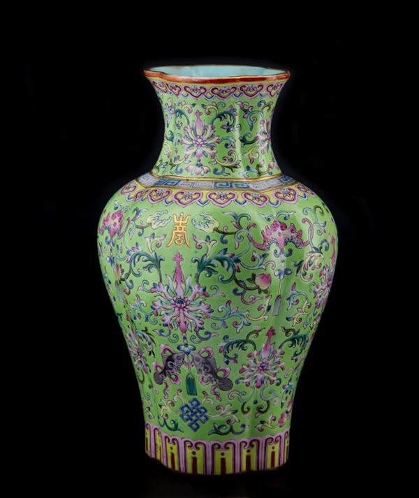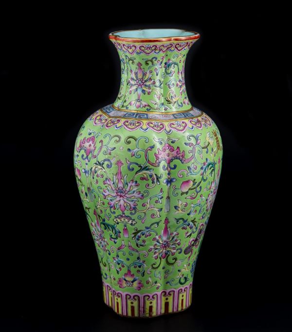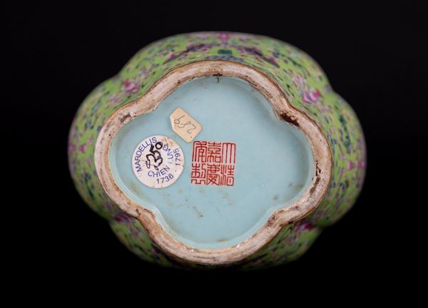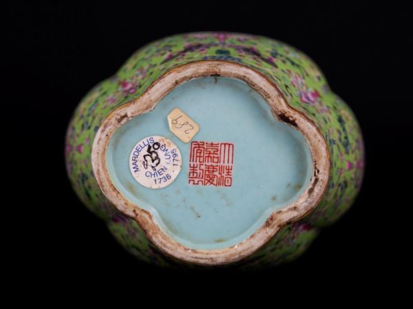 *PREMIUM: RARO VASO IMPERIALE QUADRILOBATO IN PORCELLANA FAMIGLIA ROSA A FONDO VERDE LIME, HAITANGPING, Cina, marcato e periodo Jiaqing (1796 - 1820)