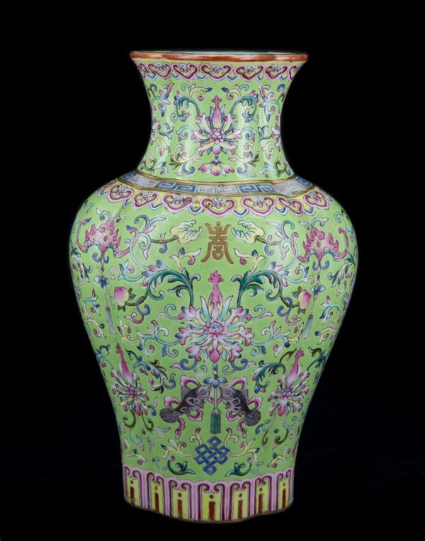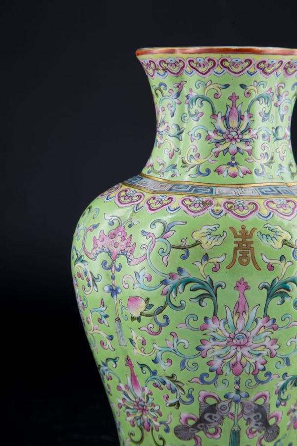Dalla bella forma con collo ristretto al centro e spalla larga che progressivamente si restringe sinuosamente fino al piede, è finemente dipinto sul corpo e sul collo con fiori di loto nei toni della famiglia rosa, che spiccano sul fondo verde lime.