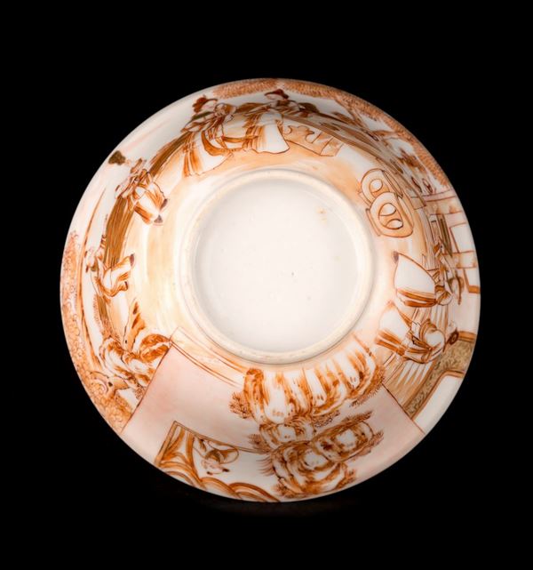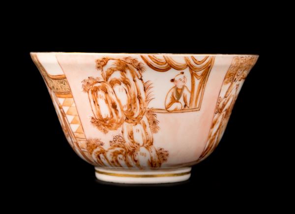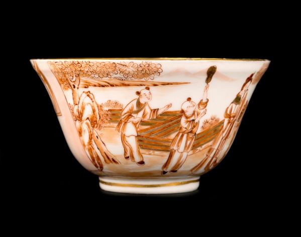 Molto ben dipinta con smalti seppia e oro con una scena continua di figure in un giardino tra rocce e alberi, il corpo in finissima porcellana ‘a guscio d’uovo’.