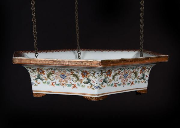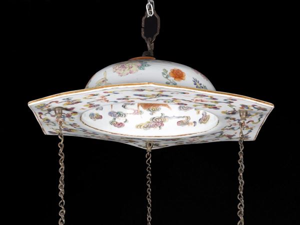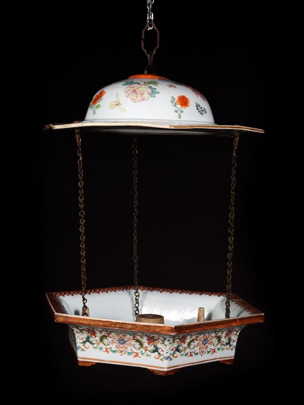 Composta da due pezzi di forma esagonale uniti da tre catene, è raffinatamente dipinta nei toni della famiglia rosa con smalti yangcai. Sul cappello all’esterno è decorata con diversi tipi di fiori e frutti, mentre all’interno presenta undici pipistrelli in rosso ferro e oro che volano tra sinuose nuvole policrome, al centro reca una svastica dorata; il basamento è dipinto su ogni lato con fiori di loto tra scroll di foglie sotto ad una fascia di pipistrelli in rosso ferro sotto ad una greca; sulla base presenta la stessa decorazione del cappello con vari fiori; al suo interno sul bordo si trova una fascia di ruyi e al centro presenta dei supporti in porcellana per lumi.