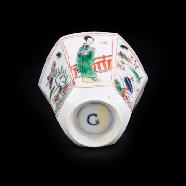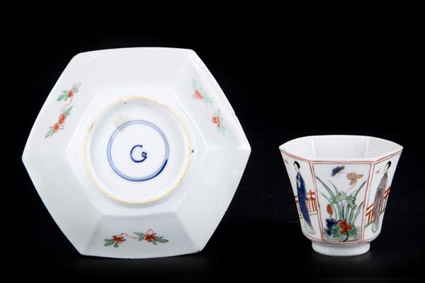 Entrambi di forma esagonale, sono dipinti con smalti famiglia verde su ogni faccia alternando una scena con una dama a composizioni floreali; sul bordo del retro del piattino sono raffigurati dei rami stilizzati, al centro elle due basi vi è un marchio in blu sotto coperta all’interno di un doppio cerchio.