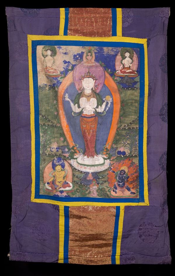 THANGKA DIPINTO SU SETA DI AVALOKITESHVARA, Tibet - Nepal, XVIII / XIX secolo