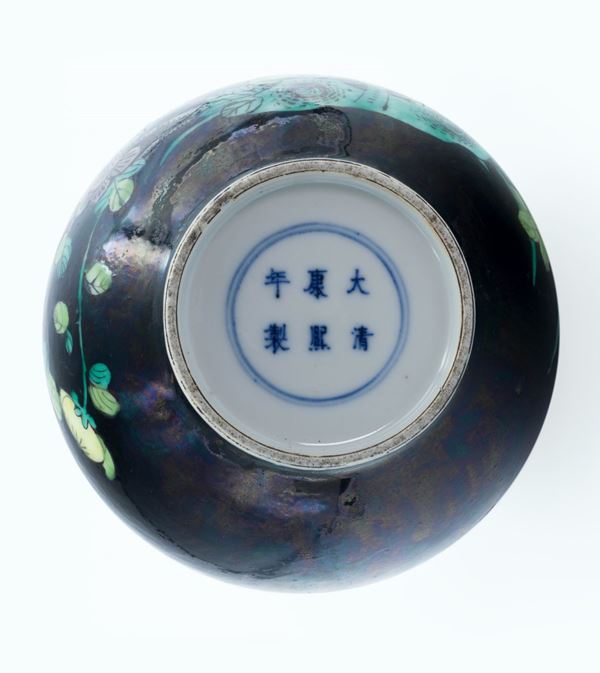 Dalla bella forma a bottiglia, è decorato nei toni della famiglia verde con uccelli tra fiori e rocce su un fondo completamente nero. Al centro della base reca il marchio apocrifo a sei caratteri dell'Imperatore Kangxi.