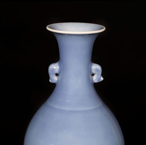 Dalla forma a colonna di balaustra, è completamente ricoperto da uno smalto di colore blu chiaro, sui lati reca due manici a forma di elefanti stilizzati; al centro della base è presente il marchio apocrifo sigillare a sei caratteri in blu sotto coperta dell’Imperatore Qianlong.