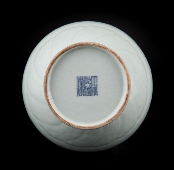 Dalla forma a colonna di balaustra, è ben inciso sul corpo ovoidale con motivi arcaici, sul piede le incisioni prendono la forma di petali fluenti e sul collo di foglie di banano stilizzate. È completamente ricoperto con uno smalto celadon; al centro della base reca il marchio apocrifo a sei caratteri in blu sotto coperta dell’Imperatore Qianlong.