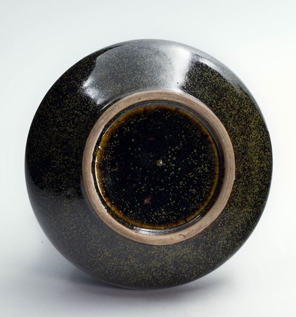 Con corpo schiacciato e bordo svasato, è completamente ricoperto da uno smalto scuro con macchie chiare.
