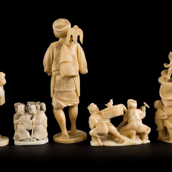 CINQUE OKIMONO IN AVORIO MARINO, Giappone, periodo Meiji (1868-1912)