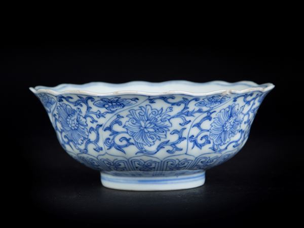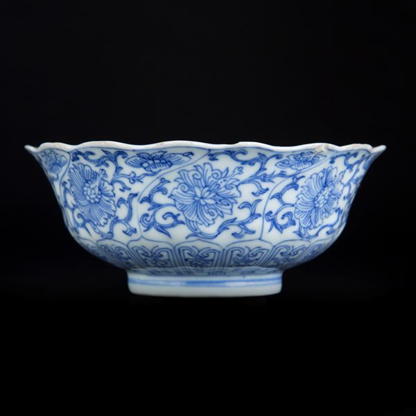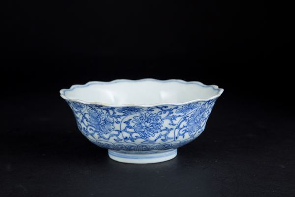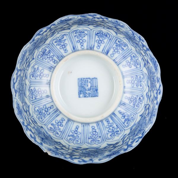 Ben modellata a forma di fiore, è dipinta in blu sotto coperta su tutto il corpo esterno con fiori; al centro dell'interno presenta un medaglione con un fiore; al centro della base presenta il marchio sigillare a sei caratteri in blu sotto coperta dell'Imperatore Qianlong. Presenta un'etichetta.