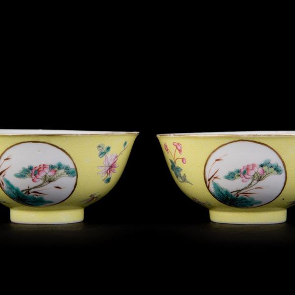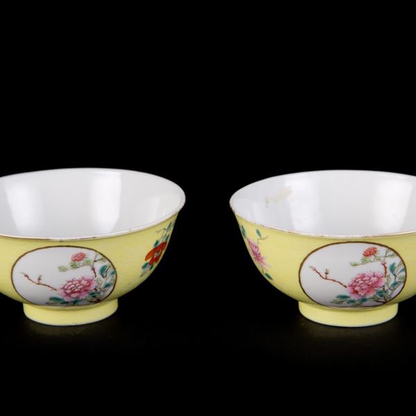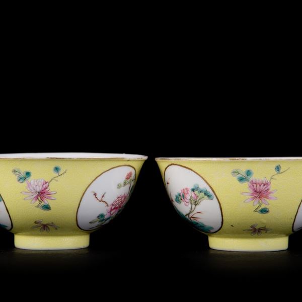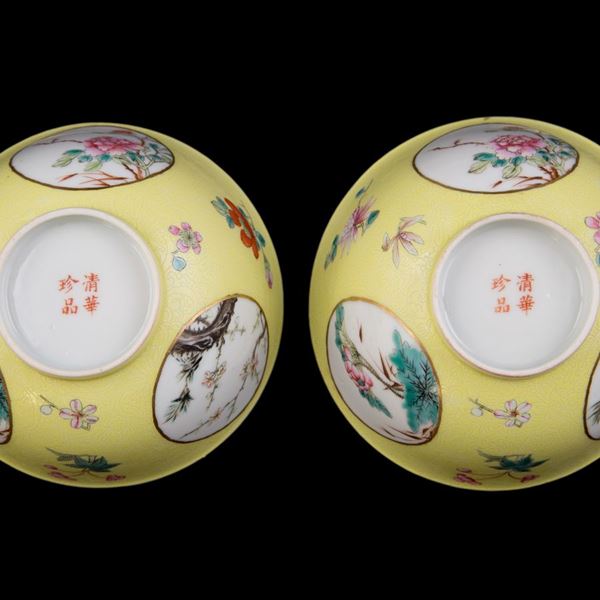 L'esterno è dipinto con fondo giallo sgraffito su cui sono dipinti fiori e tre medaglioni con fiori nei colori della famiglia rosa. Al centro della base recano il marchio in rosso a quattro caratteri Qing Hua Zhen Pin (清华珍品).