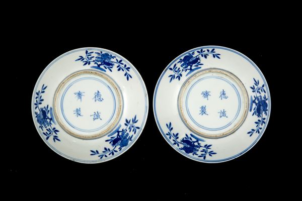 COPPIA DI PIATTINI IN PORCELLANA BIANCA E BLU, Cina, dinastia Qing, XVIII / XIX secolo