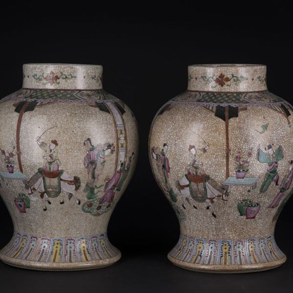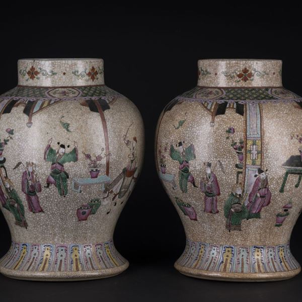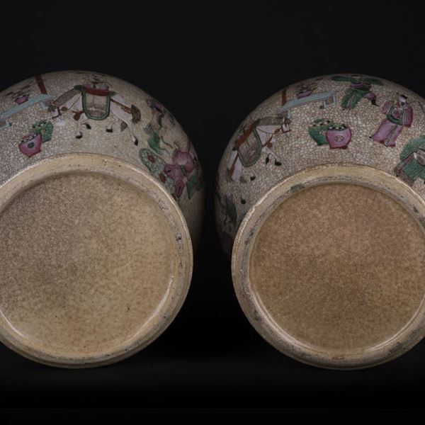 Decorati nel classico pattern di Nanchino, sono dipinti con smalti famiglia rosa con una scena di guerrieri su un fondo cracklè. Al centro della base recano un marchio.