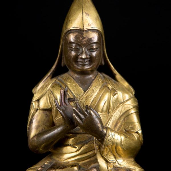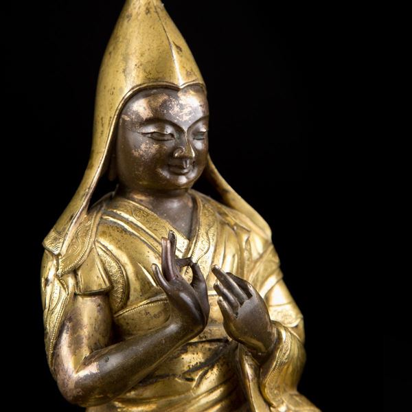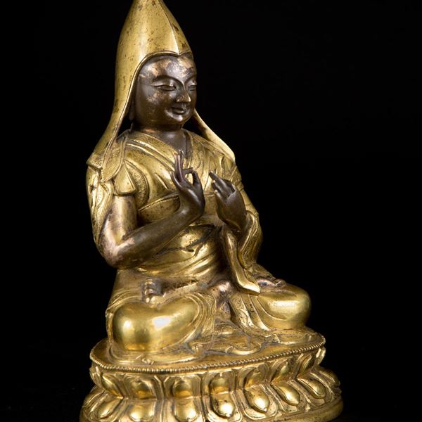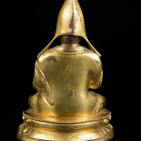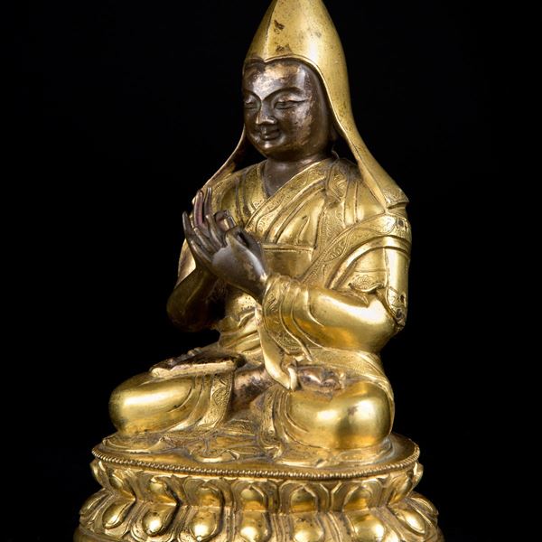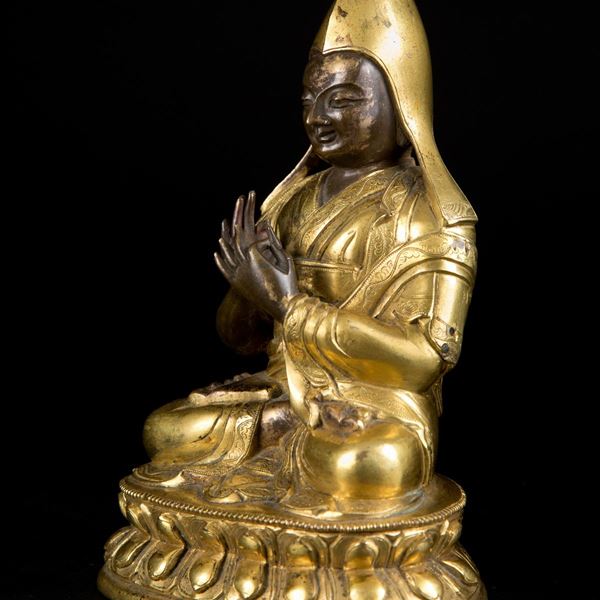 FIGURA DI TSONGKHAPA IN BRONZO DORATO, Tibet, XVIII secolo