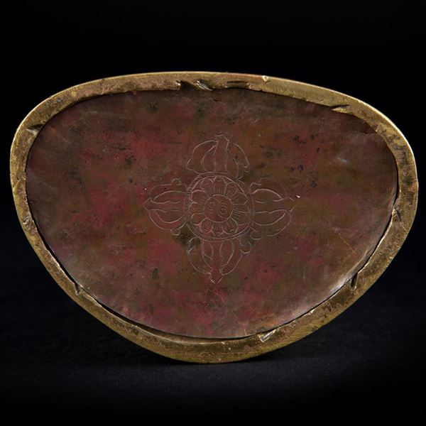 Egregiamente fusa raffigura il lama Tsongkhapa seduto in dhyanasana su una base a doppio fiore di loto con le mani alzate in dharmachakramudra, il gesto dell’insegnamento. Sulla testa indossa un cappello da pandita mentre il corpo è avvolto in vesti finemente cesellate.