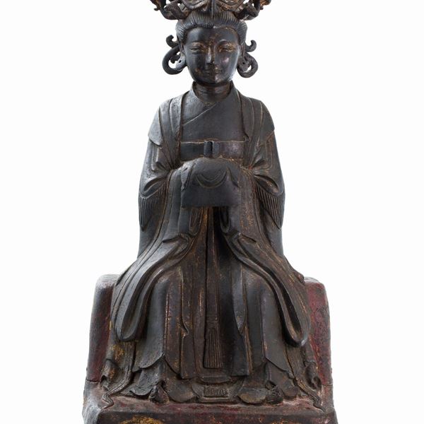 In posizione seduta poggiando i piedi su una pedana, rappresenta una donna con una lunga veste e con un copri capo con tre uccelli. Presenta tracce di doratura.