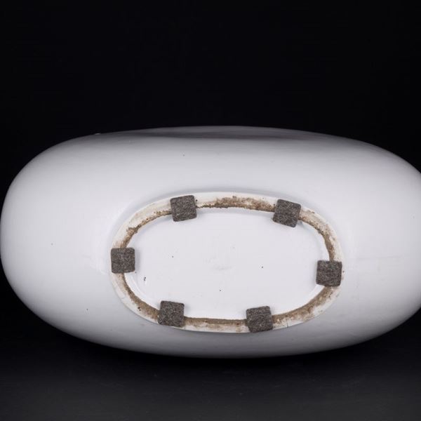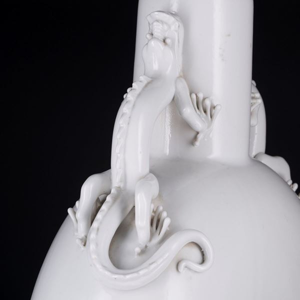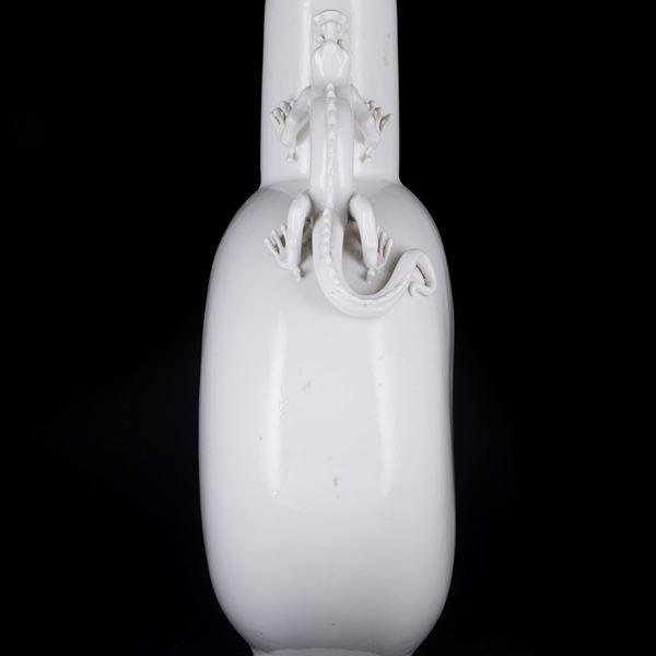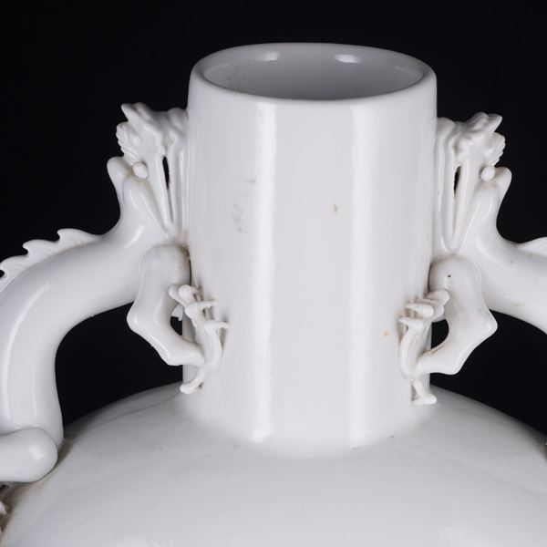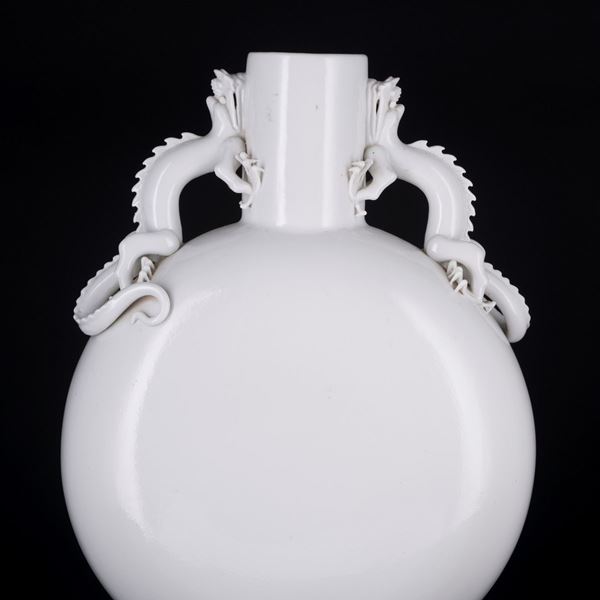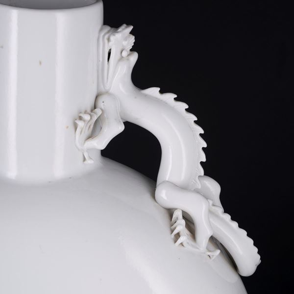 A forma di fiasca con due manici a forma di draghi, è completamente ricoperto da uno smalto bianco.