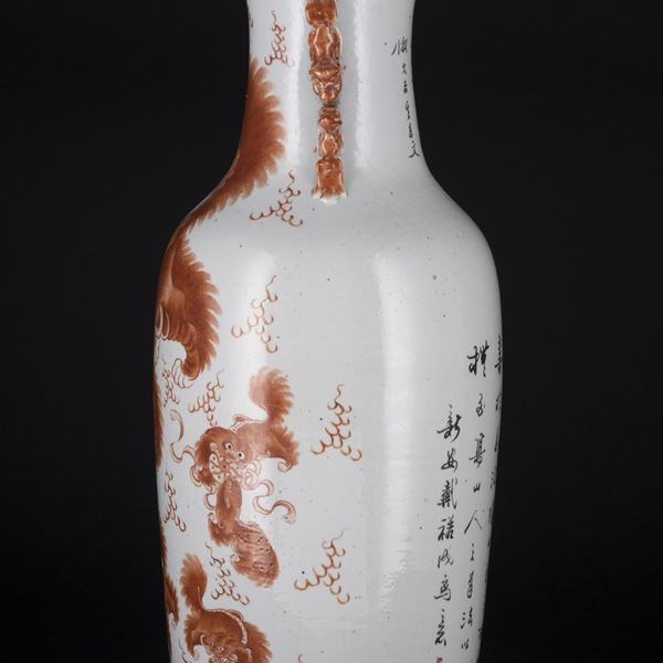 A forma di colonna di balaustro, è dipinto con cani in rosso ferro sul fronte e sul retro con iscrizioni. Al centro della base reca il marchio apocrifo stampato in rosso dell'imperatore Tongzhi.