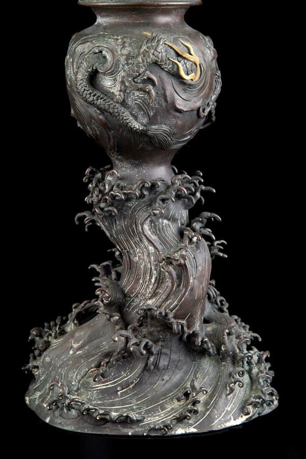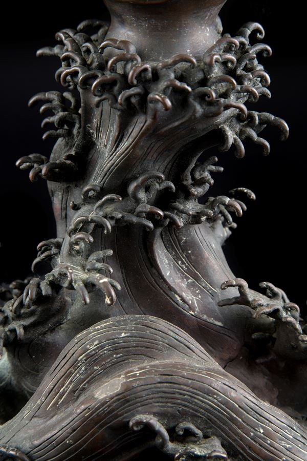 Si regge da una base ben modellata a forma di onde, il corpo è decorato con un dragone a tre artigli. Il coperchio culmina con una figura maschile.