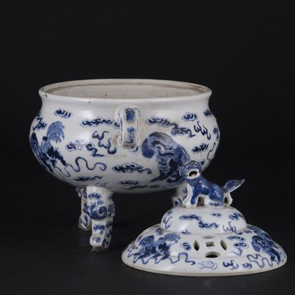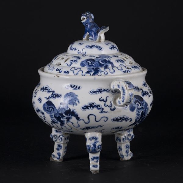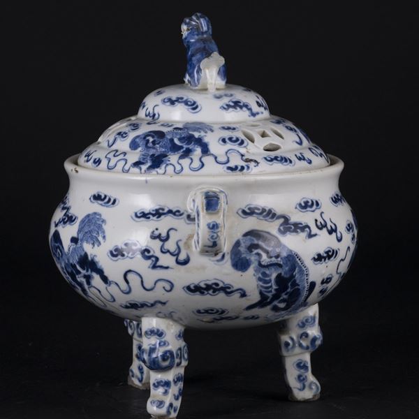 INCENSIERE IN PORCELLANA BIANCA E BLU, Cina, dinastia Qing, fine XIX secolo
