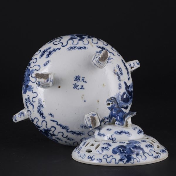 Sorretto da tre gambe affusolate, è decorato in blu sotto coperta sia sul corpo che sul coperchio con cani tra le nuvole. Al centro della base reca un marchio in blu sotto coperta a quattro caratteri.