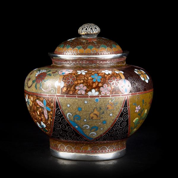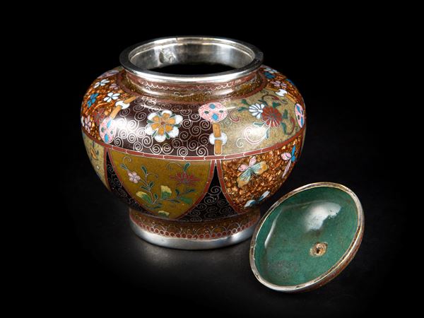 Koro cloisonnè con decoro a motivi floreali con smalti policromi trattenuti da filo d’argento. Parte inferiore con riserve a scudo con farfalle e fiori. Base circolare, anello superiore sotto il coperchio e presa in argento.