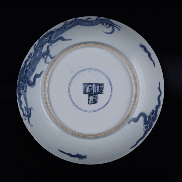 Dipinto in blu sotto coperta, all'esterno e all'interno raffigura un drago tra le nuvole, reca un marchio in blu sotto coperta all'interno di un doppio cerchio al centro della base.