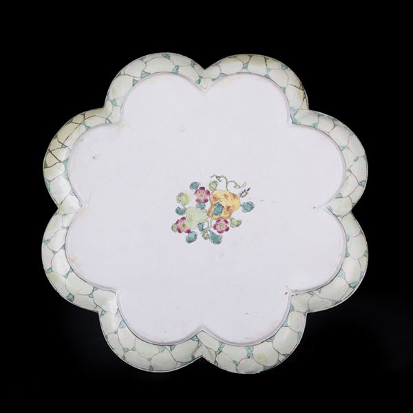 Dalla forma lobata, al centro è magnificamente dipinto con peonie, tuberi e mani di Buddha nei colori della famiglia rosa; sulla base è marcato con frutti.