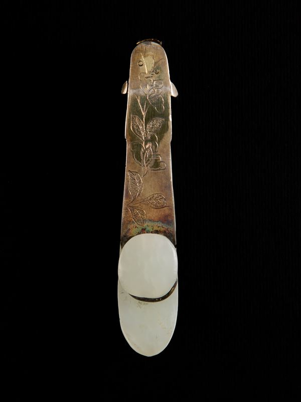 Dal bel colore celadon chiaro, è intagliata a forma di qilong; parzialmente rivestita in argento inciso con motivi floreali.