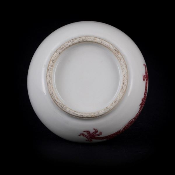 Dalla bella forma con corpo globulare e collo stretto e lungo, è ben dipinto con uno smalto violetto sopra coperta con un dragone a cinque artigli che insegue la perla fiammeggiante.