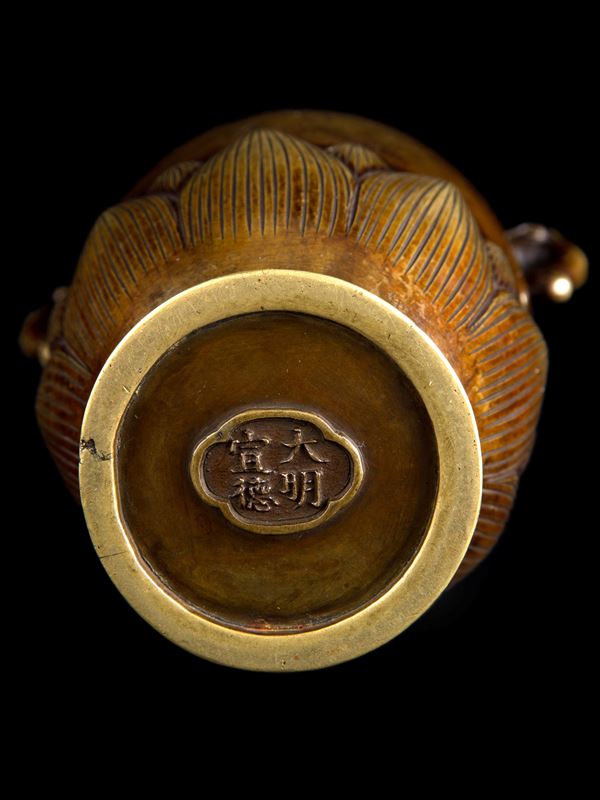Dalla bella forma ovoidale che nasce da un fiore, ai lati presenta due anse sinuose. Sulla base reca il marchio apocrifo a quattro caratteri dell'Imperatore Xuande.