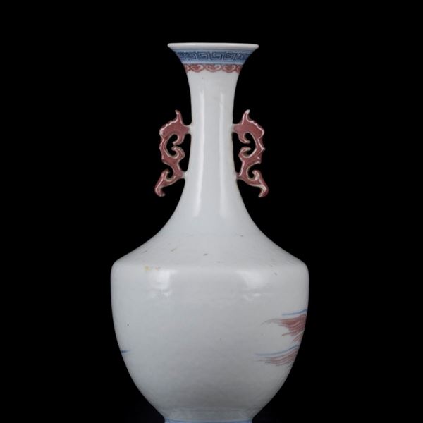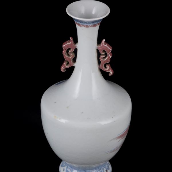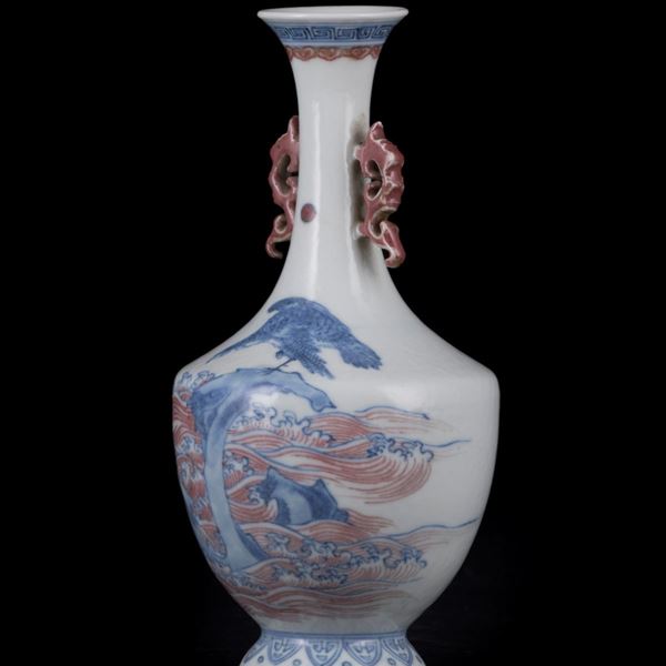 Dalla bella forma con piede scampanato, corpo semi-ovale e collo lungo e sottile con bordo svasato, è ben dipinto in blu e rosso sotto coperta con un'aquila che si poggia su una roccia in mezzo al mare. Ai lati del collo presenta due belle anse a forma di qilong stilizzati.