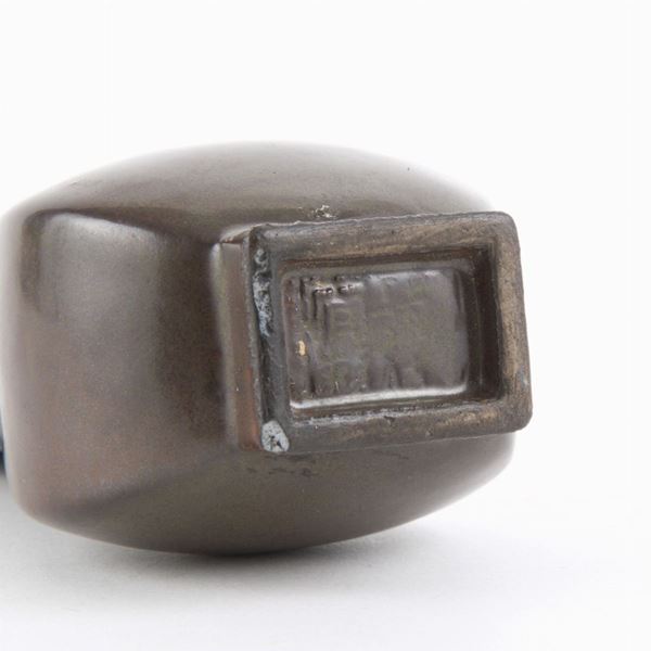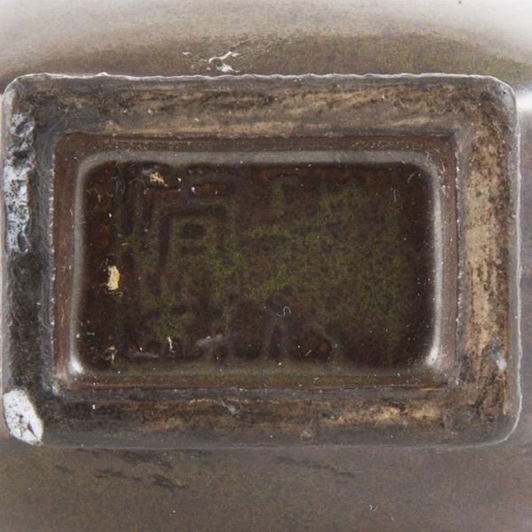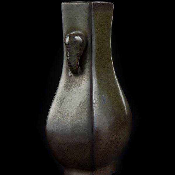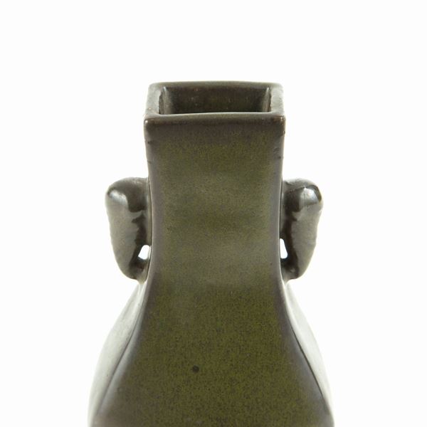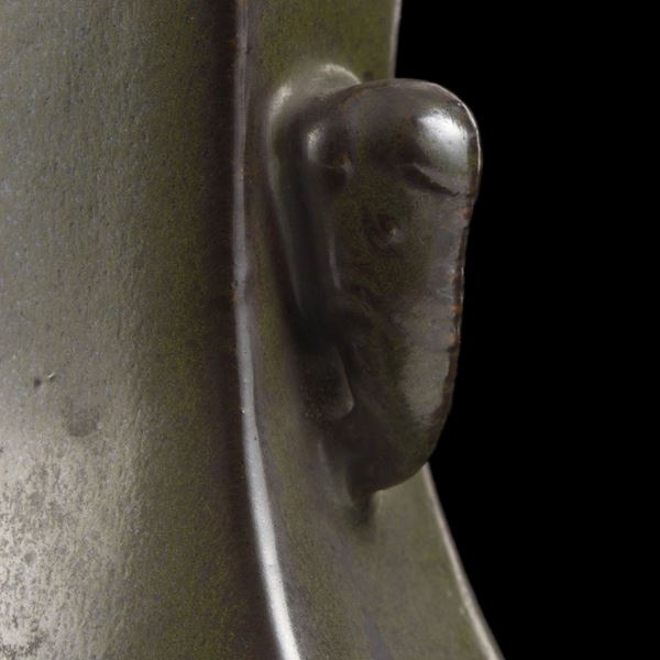 Dalla forma arcaistica a sezione quadrata con corpo allargato, collo ristretto e anse a forma di testa di elefante, è completamente ricoperto da un bello smalto color verde oliva scuro; sulla base è inciso un marchio. Sta sulla sua base in legno