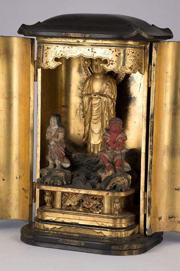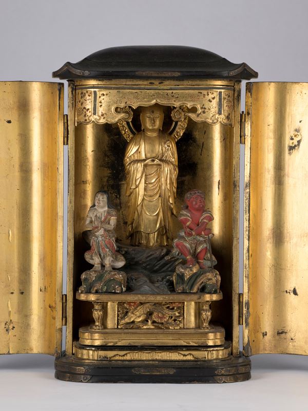 Ben scolpito in legno laccato e dorato, all'esterno è rifinito con applicazioni metalliche lavorate a punta di cesello. All'interno sono presenti un Buddha e altre due personaggi in legno dorato e laccato.