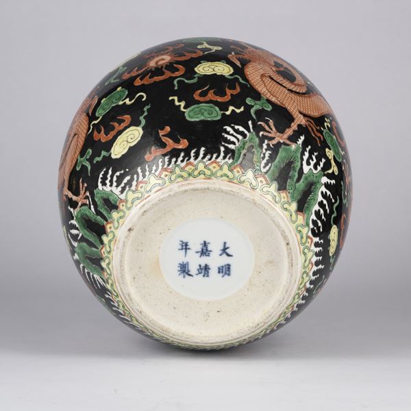 Decorata con smalti rosso, verde e giallo sopra coperta su fondo nero, raffigura due draghi che inseguono la perla fiammeggiante. Sulla base reca il marchio apocrifo a sei caratteri in blu sotto coperta dell'Imperatore Wanli.
