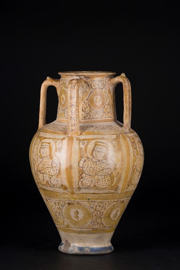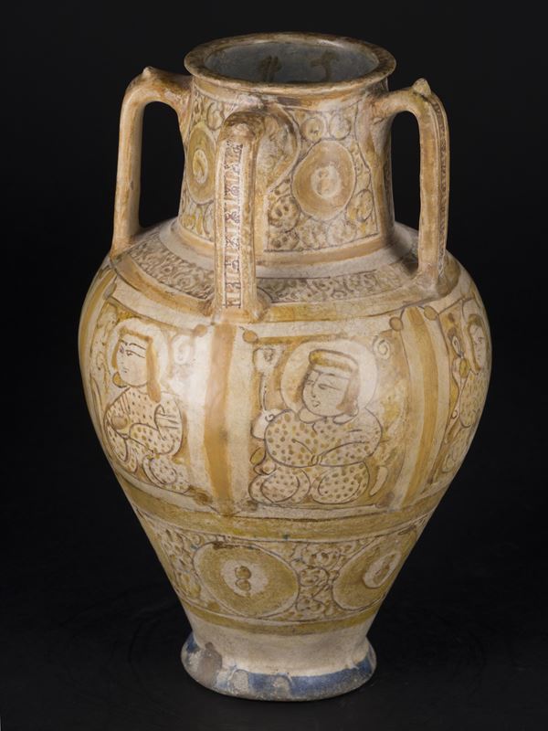 RARA ANFORA DIPINTA A LUSTRO CON FIGURE ASSISE, Iran, Kashan, fine XII secolo