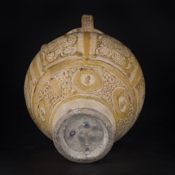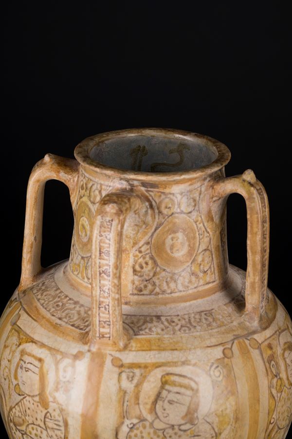 Anfora quadriansata in faenza silicea dipinta a lustro metallico marrone chiaro, il piede decorato con splash in blu cobalto. Il corpo reca nella parte inferiore un’ampia fascia campita con rondelle contenenti motivi vegetali stilizzati su sfondo di tralci di vite. Il registro superiore è suddiviso in una teoria di pannelli che incorniciano figure assise su sfondo vegetale, la spalla è campita a tralci di vite, mentre la parete esterna del collo riproduce il decoro a rondelle su sfondo fitomorfo già incontrato nella parte inferiore del corpo. La parte interna del collo è dipinta in blu cobalto con un’iscrizione in lustro marrone in cufico foliato. Motivi epigrafici e pseudo epigrafici campiscono anche le quattro anse con poggiadito.