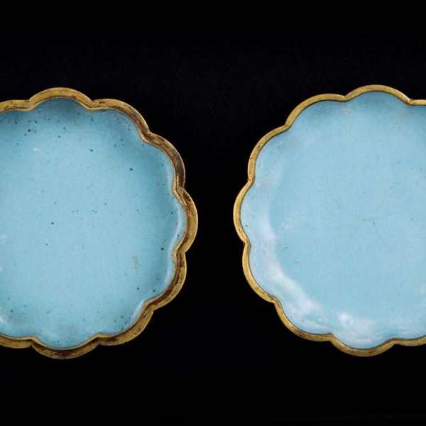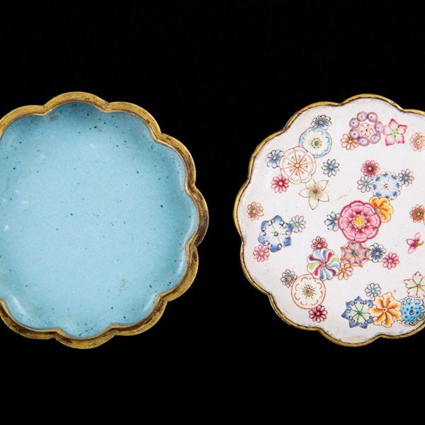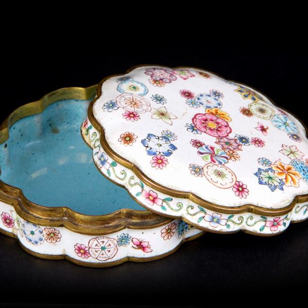 Di forma lobata con dodici petali, la scatola e il coperchio sono superbamente decorati all'esterno con rosette, design noto anche come 'posy', nei colori della famiglia rosa, l'interno è ricoperto da un bello smalto turchese; al centro della base reca il marchio quadrato a quattro caratteri in rosso dell'Imperatore Qianlong.