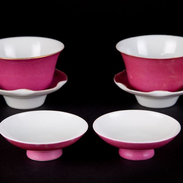 Composto da due tazze, due piattini e due coperchi, sono ricoperti da un bello smalto rosa intenso. Tutti i pezzi sono marcati col marchio a sei caratteri dell'Imperatore Guangxu in rosso ferro.