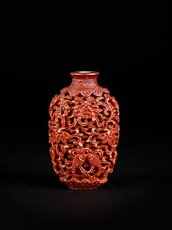 Ben modellata e forata, è decorata con i bajixiang tra le nuvole. È completamente ricoperta da un colore rosso corallo.