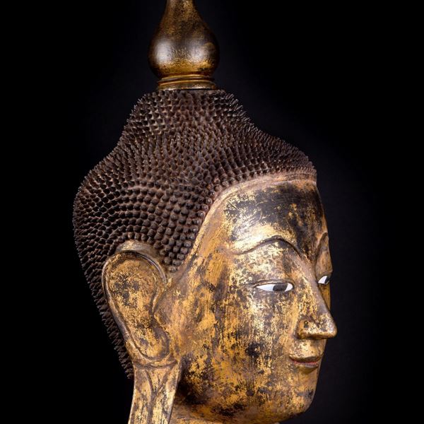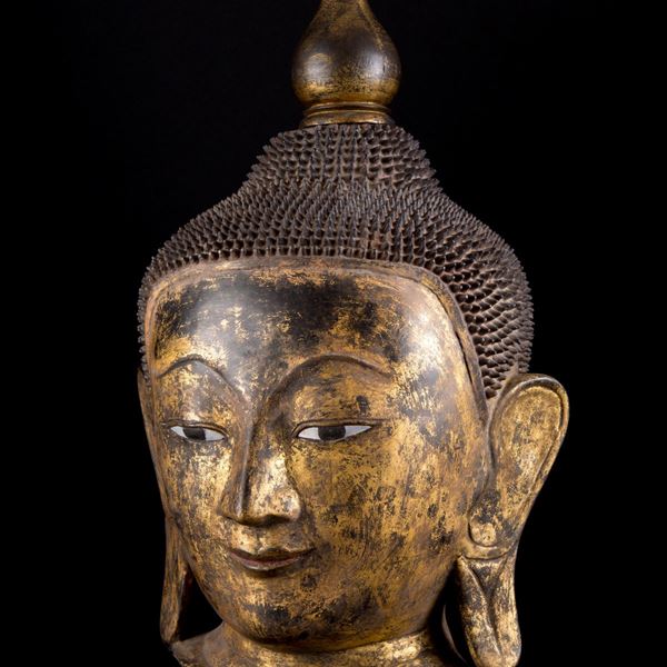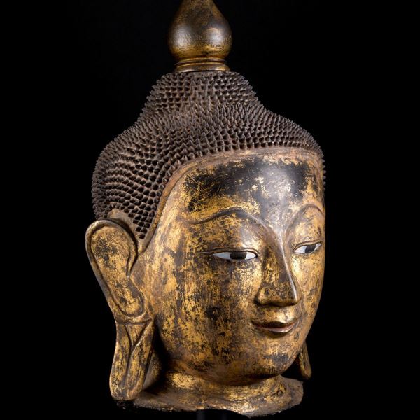 TESTA DI BUDDHA IN CARTAPESTA LACCATA E DORATA, Birmania, XIX secolo